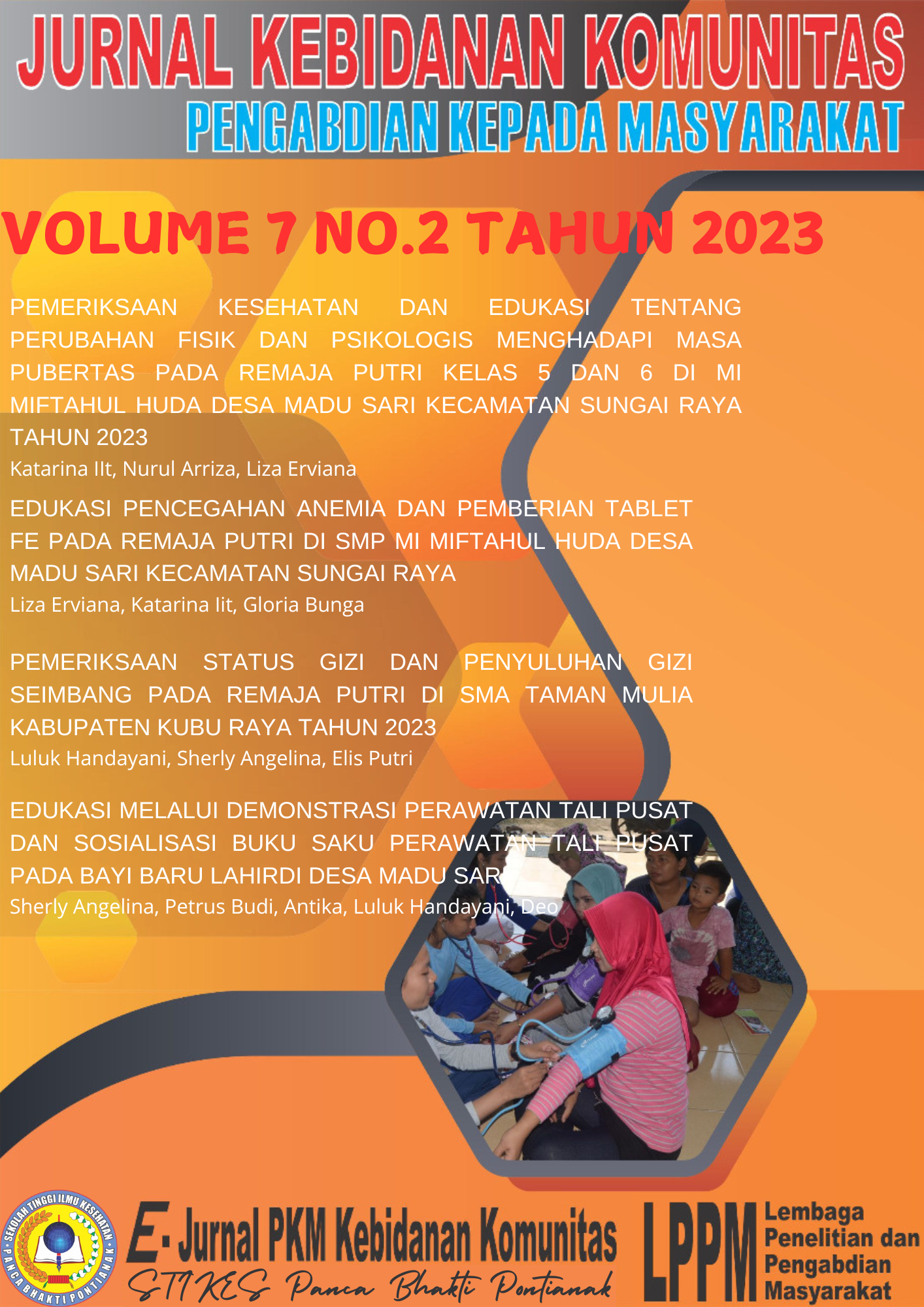 Vol. 7 No. 2 (2023)Jurnal Pengabdian dan Pemberdayaan Kepada Masyarakat (PKM) diterbitkan langsung oleh lembaga publikasi ilmiah dan penerbitan STIKES Panca Bhakti Pontianak. Berisikan hasil kegiatan - kegiatan pengabdian dan pemberdayaan masyarakat berupa penerapan berbagai ilmu diantaranya : asuhan kebidanan pada ibu hamil, bersalin, nifas, neonatus dan bayi baru lahir serta komunitas. Ruang lingkup pengabdian masyarakat meliputi Pelatihan, Penyuluhan, Pendidikan kesehatan dan Pemberdayaan masyarakat dengan kegiatan penanganan dan pencegahan berbagai potensi kendala, tantangan, dan masalah kesehatan yang ada di Masyarakat.