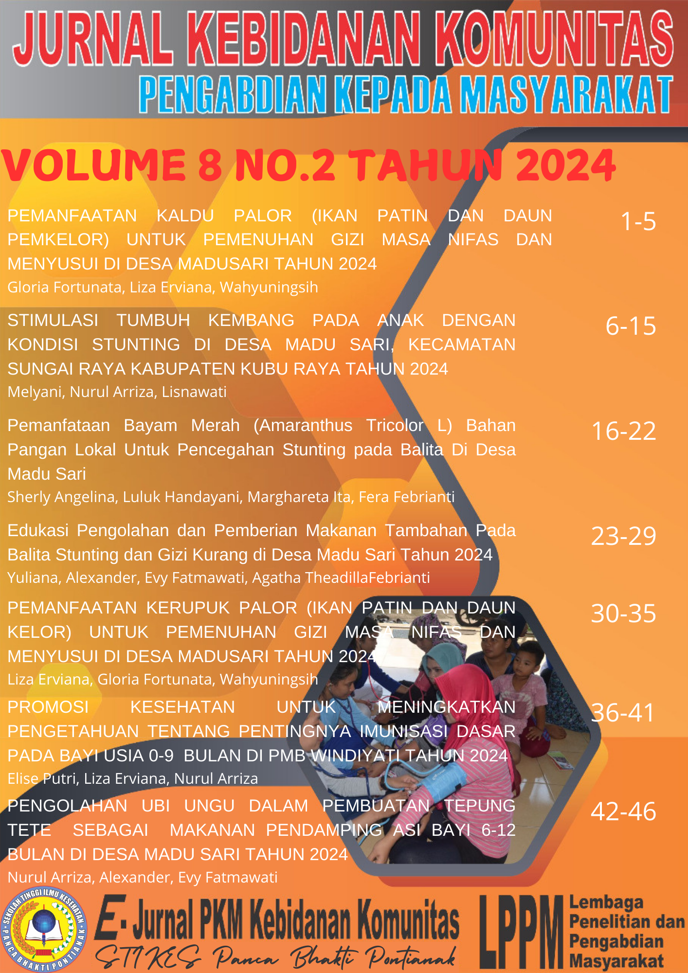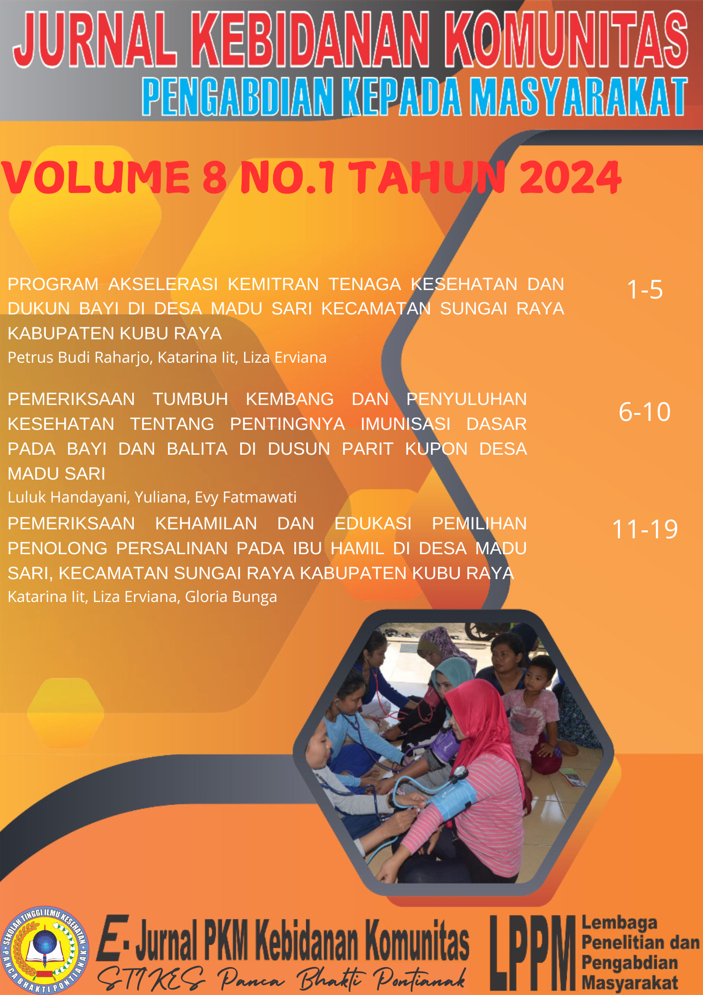 Vol. 9 No. 1 (2025)Jurnal Pengabdian dan Pemberdayaan Kepada Masyarakat (PKM) diterbitkan langsung oleh lembaga publikasi ilmiah dan penerbitan STIKES Panca Bhakti Pontianak. Berisikan hasil kegiatan - kegiatan pengabdian dan pemberdayaan masyarakat berupa penerapan berbagai ilmu diantaranya : asuhan kebidanan pada ibu hamil, bersalin, nifas, neonatus dan bayi baru lahir serta komunitas. Ruang lingkup pengabdian masyarakat meliputi Pelatihan, Penyuluhan, Pendidikan kesehatan dan Pemberdayaan masyarakat dengan kegiatan penanganan dan pencegahan berbagai potensi kendala, tantangan, dan masalah kesehatan yang ada di Masyarakat.