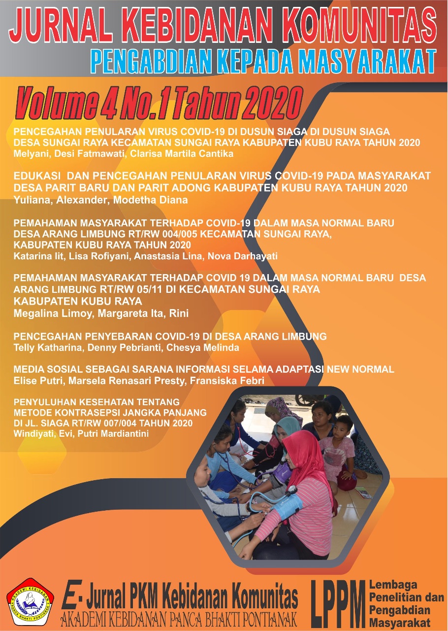 Vol. 4 No. 1 (2020)Jurnal Pengabdian dan pemberdayaan kepada masyarakat (PPM) diterbitkan langsung oleh lembaga publikasi ilmiah dan penerbitan Akademi Kebidanan Panca Bhakti Pontianak. Berisikan hasil kegiatan - kegiatan pengabdian dan pemberdayaan masyarakat berupa penerapan berbagai ilmu diantaranya : asuhan kebidanan pada ibu hamil, bersalin, nifas, neonatus dan bayi baru lahir serta komunitas. Ruang lingkup pengabdian masyarakat meliputi Pelatihan, Penyuluhan, Pendidikan kesehatan dan Pemberdayaan masyarakat dengan kegiatan penanganan dan pencegahan berbagai potensi kendala, tantangan, dan masalah kesehatan yang ada di Masyarakat.
