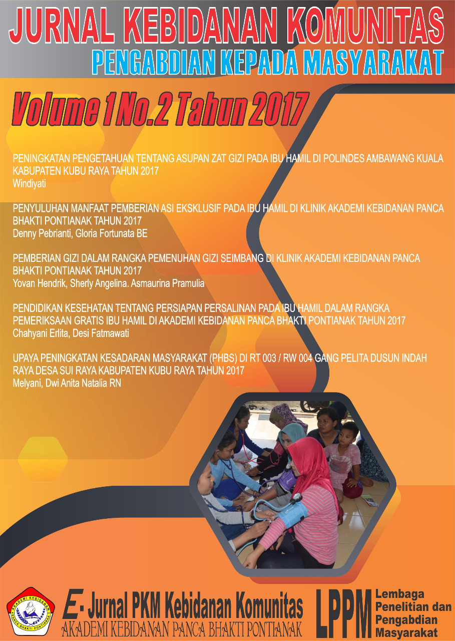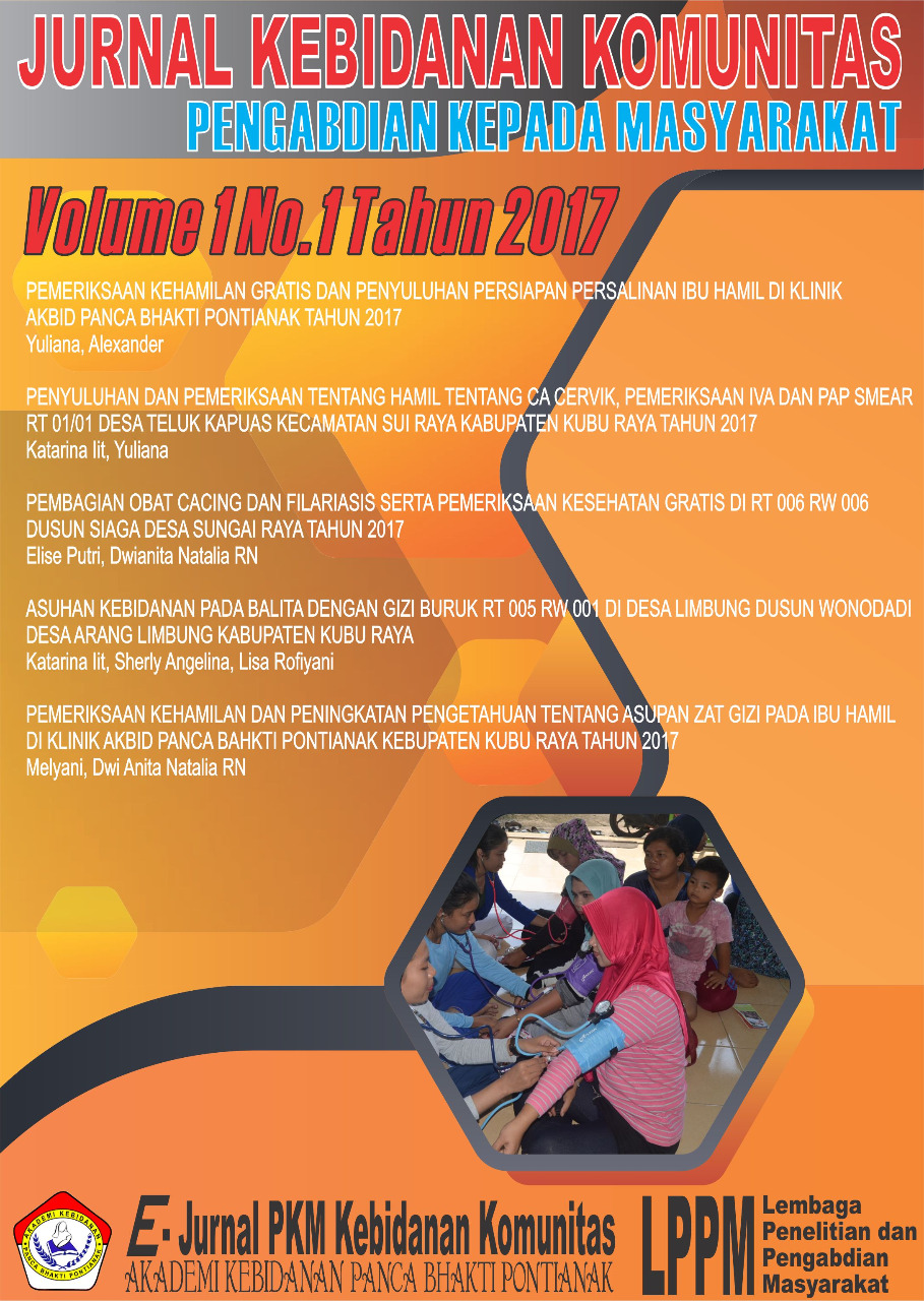 Vol. 1 No. 2 (2017)Jurnal Pengabdian dan pemberdayaan kepada masyarakat (PPM) diterbitkan langsung oleh lembaga publikasi ilmiah dan penerbitan Akademi Kebidanan Panca Bhakti Pontianak. Berisikan hasil kegiatan - kegiatan pengabdian dan pemberdayaan masyarakat berupa penerapan berbagai ilmu diantaranya : asuhan kebidanan pada ibu hamil, bersalin, nifas, neonatus dan bayi baru lahir serta komunitas. Ruang lingkup pengabdian masyarakat meliputi Pelatihan, Penyuluhan, Pendidikan kesehatan dan Pemberdayaan masyarakat dengan kegiatan penanganan dan pencegahan berbagai potensi kendala, tantangan, dan masalah kesehatan yang ada di Masyarakat.