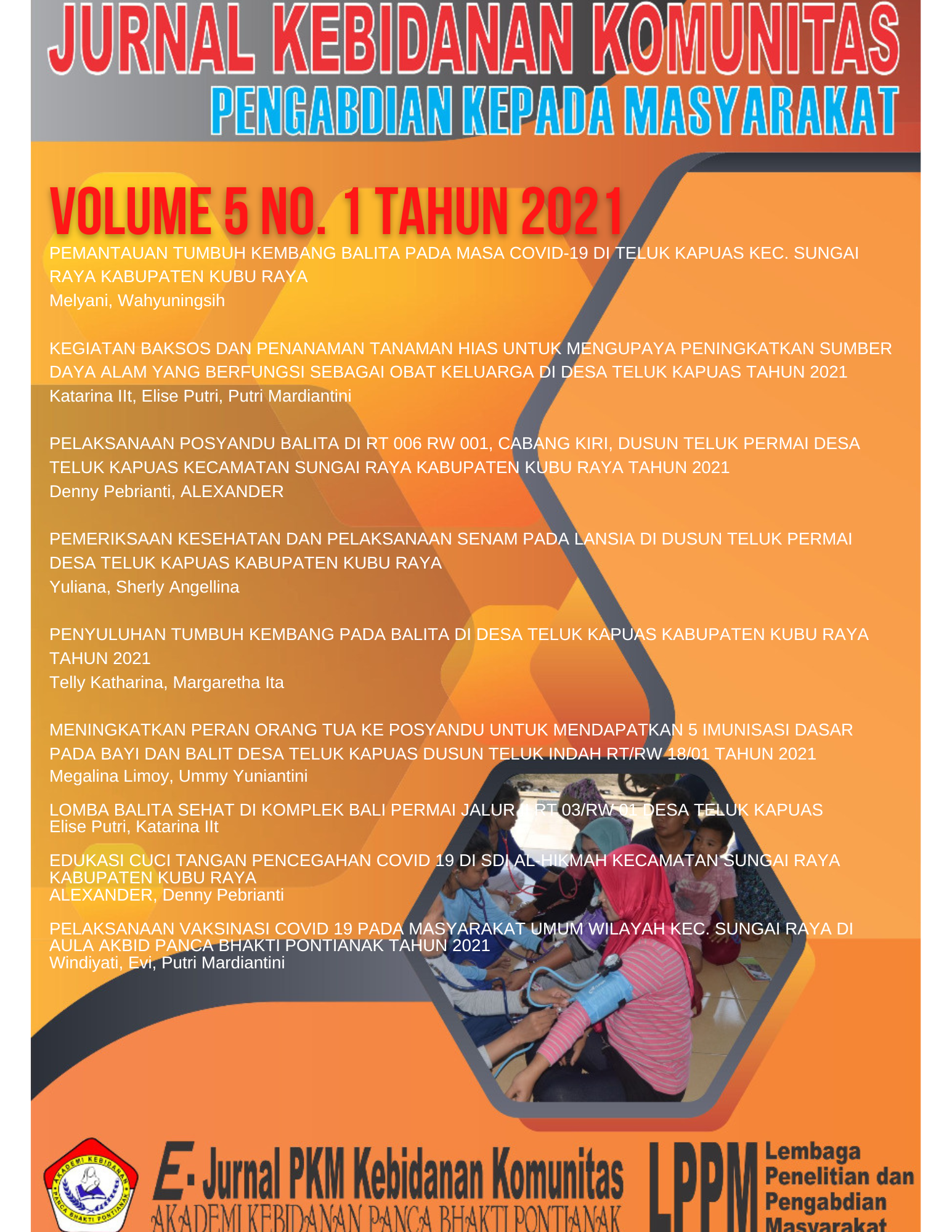 Vol. 5 No. 1 (2021)Jurnal Pengabdian dan pemberdayaan kepada masyarakat (PPM) diterbitkan langsung oleh lembaga publikasi ilmiah dan penerbitan Akademi Kebidanan Panca Bhakti Pontianak. Berisikan hasil kegiatan - kegiatan pengabdian dan pemberdayaan masyarakat berupa penerapan berbagai ilmu diantaranya : asuhan kebidanan pada ibu hamil, bersalin, nifas, neonatus dan bayi baru lahir serta komunitas. Ruang lingkup pengabdian masyarakat meliputi Pelatihan, Penyuluhan, Pendidikan kesehatan dan Pemberdayaan masyarakat dengan kegiatan penanganan dan pencegahan berbagai potensi kendala, tantangan, dan masalah kesehatan yang ada di Masyarakat.