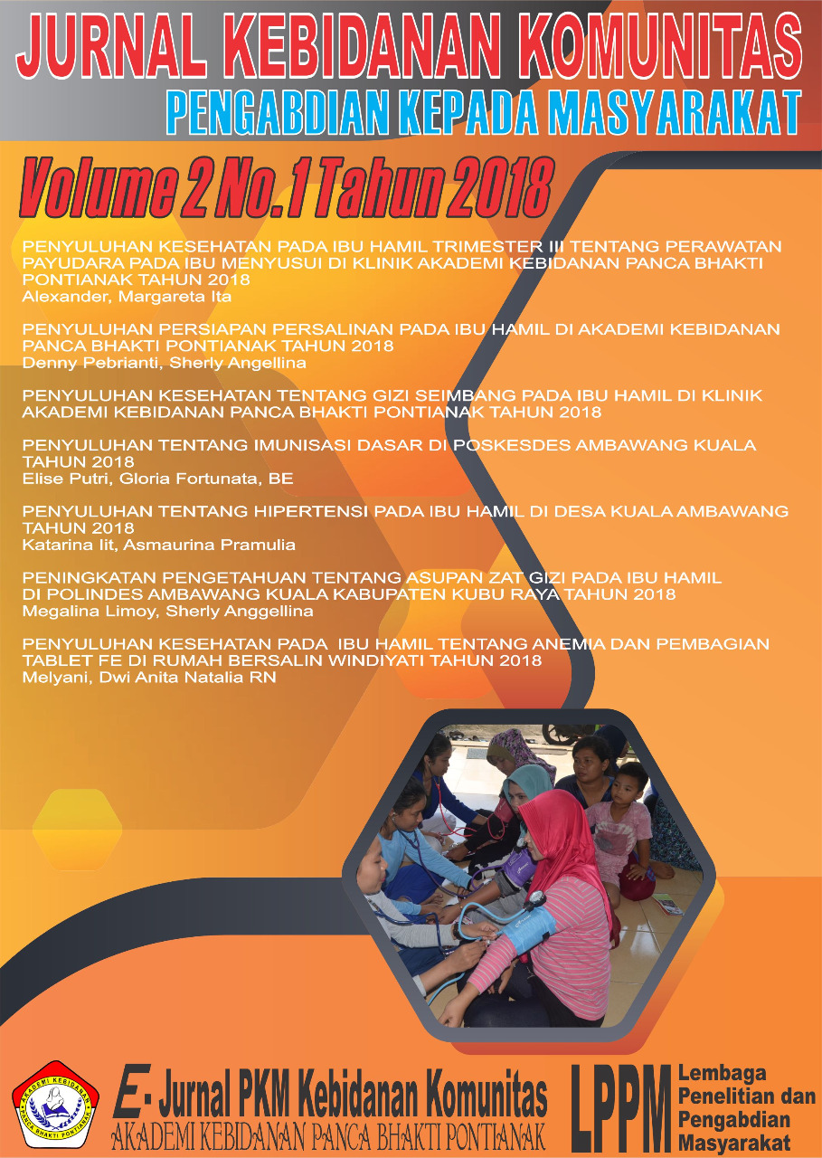 Vol. 2 No. 1 (2018)Jurnal Pengabdian dan pemberdayaan kepada masyarakat (PPM) diterbitkan langsung oleh lembaga publikasi ilmiah dan penerbitan Akademi Kebidanan Panca Bhakti Pontianak. Berisikan hasil kegiatan - kegiatan pengabdian dan pemberdayaan masyarakat berupa penerapan berbagai ilmu diantaranya : asuhan kebidanan pada ibu hamil, bersalin, nifas, neonatus dan bayi baru lahir serta komunitas. Ruang lingkup pengabdian masyarakat meliputi Pelatihan, Penyuluhan, Pendidikan kesehatan dan Pemberdayaan masyarakat dengan kegiatan penanganan dan pencegahan berbagai potensi kendala, tantangan, dan masalah kesehatan yang ada di Masyarakat.
