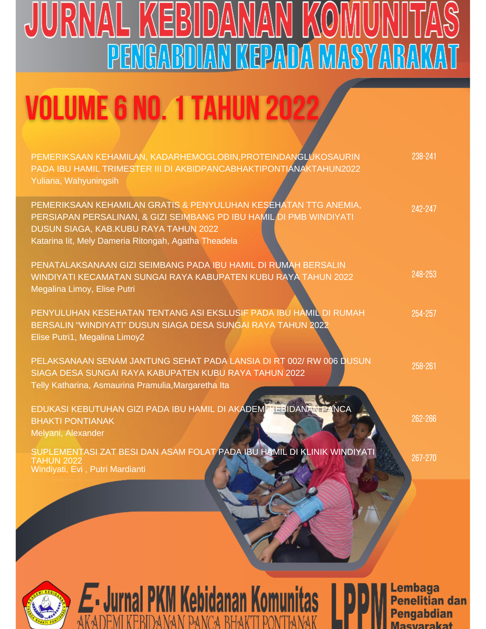 Vol. 6 No. 1 (2022)Jurnal Pengabdian dan pemberdayaan kepada masyarakat (PKM) diterbitkan langsung oleh lembaga publikasi ilmiah dan penerbitan Akademi Kebidanan Panca Bhakti Pontianak. Berisikan hasil kegiatan - kegiatan pengabdian dan pemberdayaan masyarakat berupa penerapan berbagai ilmu diantaranya : asuhan kebidanan pada ibu hamil, bersalin, nifas, neonatus dan bayi baru lahir serta komunitas. Ruang lingkup pengabdian masyarakat meliputi Pelatihan, Penyuluhan, Pendidikan kesehatan dan Pemberdayaan masyarakat dengan kegiatan penanganan dan pencegahan berbagai potensi kendala, tantangan, dan masalah kesehatan yang ada di Masyarakat.