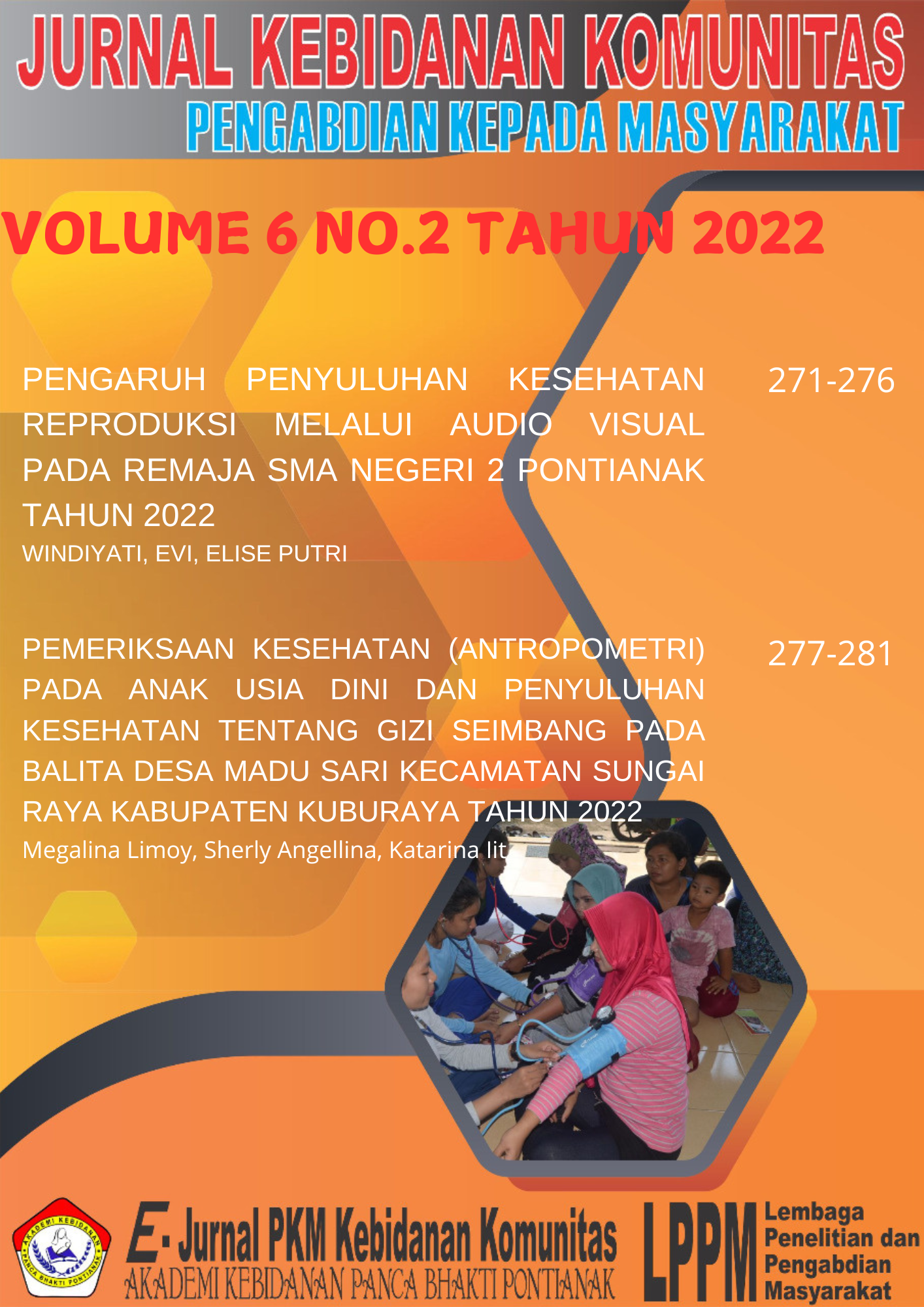 Vol. 6 No. 2 (2022)Jurnal Pengabdian dan pemberdayaan kepada masyarakat (PKM) diterbitkan langsung oleh lembaga publikasi ilmiah dan penerbitan Akademi Kebidanan Panca Bhakti Pontianak. Berisikan hasil kegiatan - kegiatan pengabdian dan pemberdayaan masyarakat berupa penerapan berbagai ilmu diantaranya : asuhan kebidanan pada ibu hamil, bersalin, nifas, neonatus dan bayi baru lahir serta komunitas. Ruang lingkup pengabdian masyarakat meliputi Pelatihan, Penyuluhan, Pendidikan kesehatan dan Pemberdayaan masyarakat dengan kegiatan penanganan dan pencegahan berbagai potensi kendala, tantangan, dan masalah kesehatan yang ada di Masyarakat.